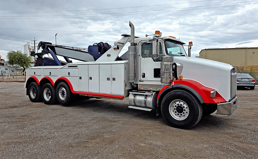 This used 60 ton wrecker has a CAT 475HP engine with 18 speed manual transmission and steerable lift axle. The Jerr-Dan wrecker body has an independent boom and dual 50k winches.