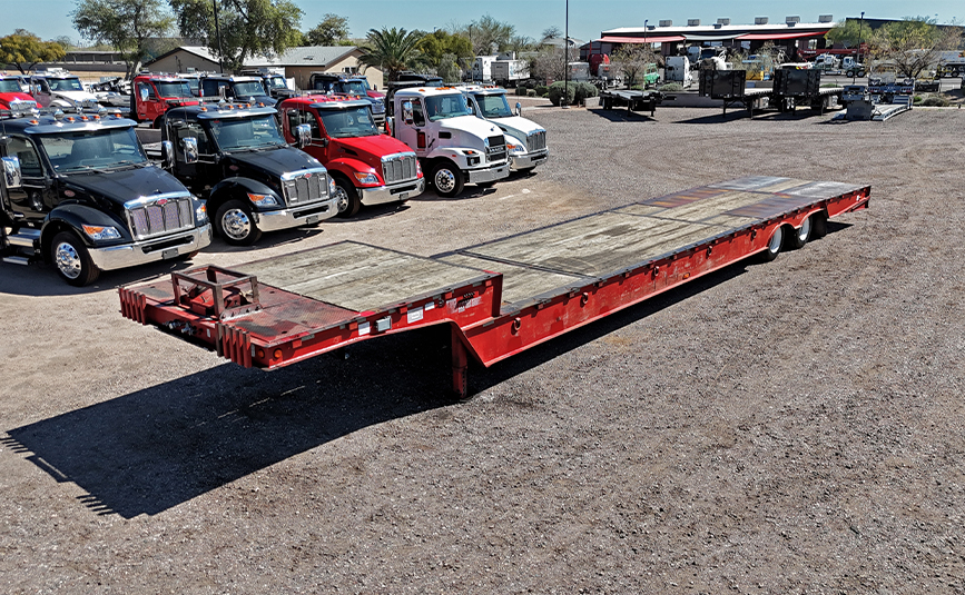 The trailer includes a 9'9" wood-decked upper deck and a 38'3" wood lower deck, providing ample space for a wide range of cargo. The 8' hydraulic tail combined with a 4' flip-under ramp allows for smooth loading angles and convenient operation when loading wheeled or tracked equipment.